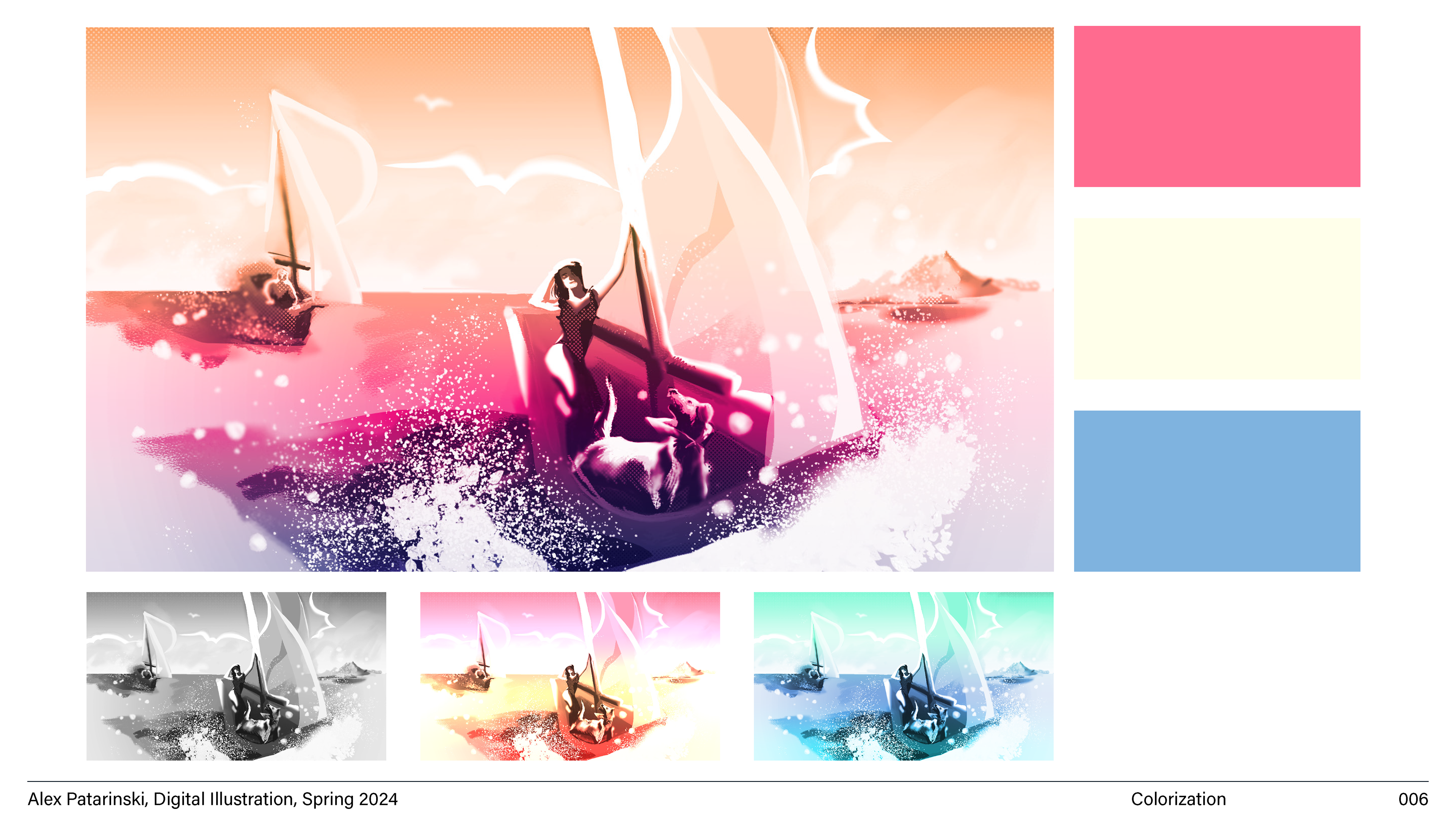 This character and figure design project explores the creation of a unique narrative scene, with a strong focus on character design and visual storytelling. The project begins with figure studies, allowing for an in-depth understanding of human anatomy, movement, and proportions. Fabric and costume studies follow, exploring how clothing and textures can complement the character’s identity and narrative. Animal studies are incorporated to design a creature that complements the story, focusing on anatomy, posture, and behavior. The final artwork presents a woman approaching a creature, emphasizing the contrast between the characters and their surroundings. The piece is characterized by bold use of color and a flat, graphic style, enhancing the dramatic tension and visual impact of the narrative. The design choices work together to create an engaging and dynamic scene that invites the viewer to explore the relationship between the characters.